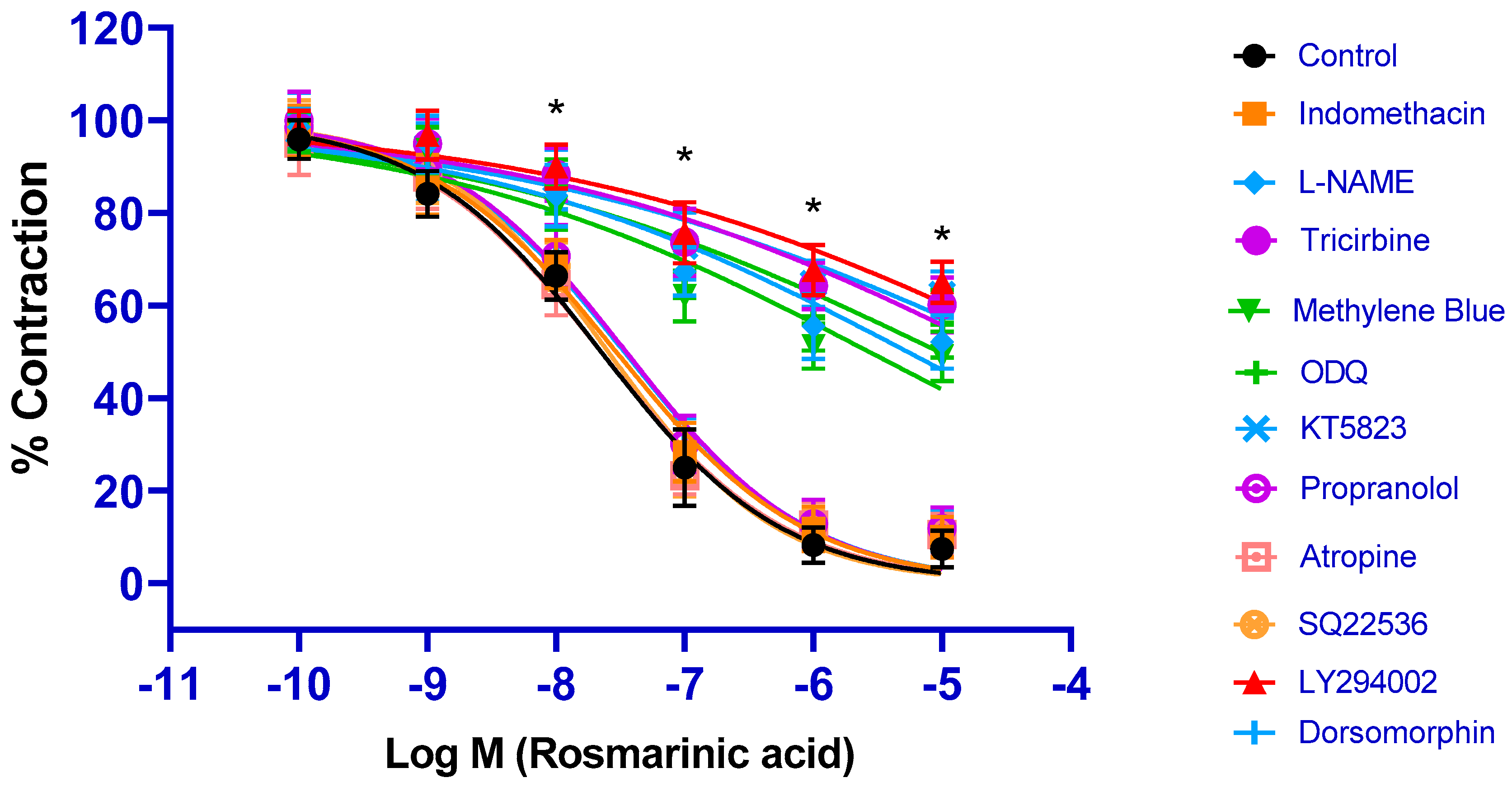 | Rosmarinic acid | Vasorelaxant effect | 10−10–10−5 M | 1362.63 ± 18.36 | 7.67 ± 0.04 | 93.70 ± 5.26 | 8 | - |