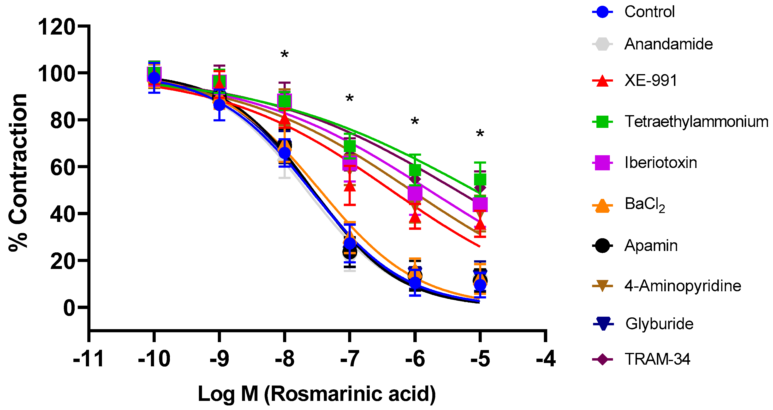 | Iberiotoxin | BKCa channel blocker | 10 nM | 1442.11 ± 43.40 | 5.79 ± 0.12 | 56.13 ± 9.53 | 8 | [34] |