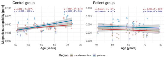 The results of the linear regression analysis of age and magnetic susceptibility in the CNA and putamen are presented in