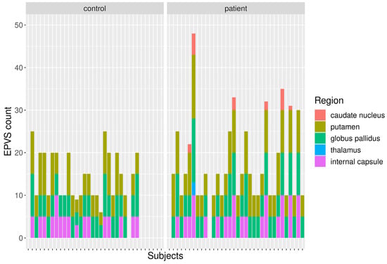 Visual rating revealed a higher prevalence of EPVS in patients compared to controls in commonly affected regions (putamen: 6 vs. 7.2, globus pallidus: 5.6 vs. 6.6, and internal capsule: 3.2 vs. 3.6). Additionally, more regions were affected in the patients. In the HC group, no EPVS were found in the thalamus or caudate nucleus.