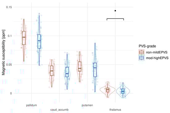 Figure 5 shows how the presence of EPVS affected regional susceptibility. Except for the putamen, high to moderate EPVS was associated with lower magnetic susceptibility. However, there is a non-significant trend for the mod-highEPVS group to have lower susceptibility than the reference non-mildEPVS group in the thalamus, but it does not reach the typical threshold for statistical significance (Est. = −0.002748, std.err. = 0.001557, df = 48.7,