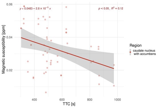 Magnetic susceptibility was also associated with the TTC of the cognitive tests, with a longer TTC related to lower susceptibility. However, a significant correlation was found only in the CNA of HE patients (