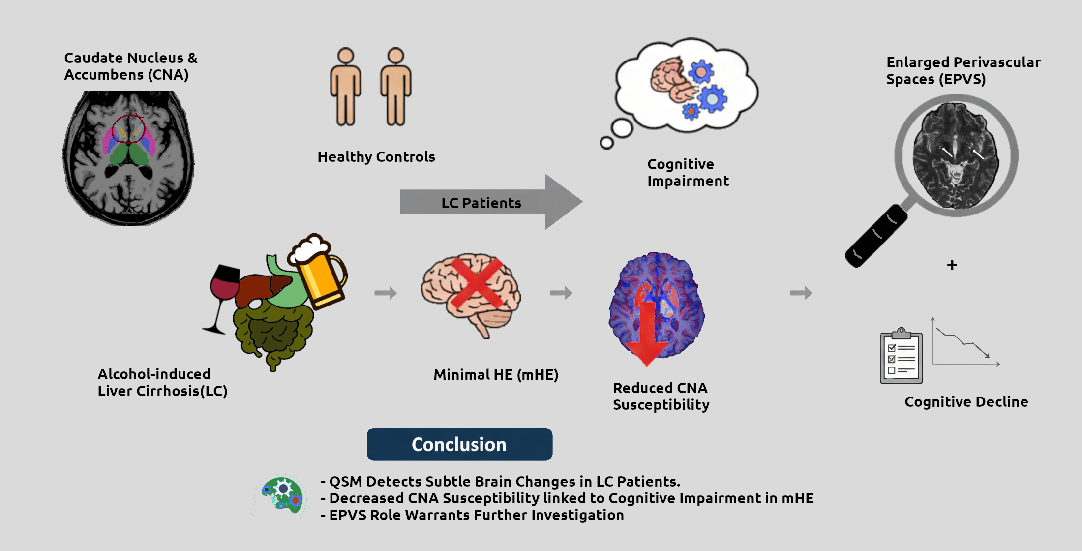 40]. With a healthy control group, we cannot definitively separate the neurotoxic effects of chronic alcohol consumption from the neurobiological consequences of cirrhosis. However, the observed EPVS burden demonstrated a specific association with poorer cognitive performance (mHE) and distinct magnetic susceptibility changes in the Caudate Nucleus. This pattern, localized to the deep gray matter and correlated with current metabolic cognitive status, suggests that glymphatic dysfunction secondary to liver pathology is a significant contributing factor, distinct from the generalized cortical atrophy typically associated with alcohol use disorder alone. Second, the study was constrained by a relatively small sample size, which may have limited the statistical power to detect subtle differences between the groups and reduced the generalization of the findings. We acknowledge that the relatively small sample size is a limitation of this study. A larger sample would have provided greater statistical power to detect smaller differences between the groups. However, we believe the statistical significance observed for several key outcomes, even with the current sample size, highlights the presence of a meaningful effect. The significant findings indicate that the differences between the groups for these particular variables are likely genuine, as they were strong enough to be detected despite the lower statistical power. As an exploratory investigation, this study did not have a pre-determined effect size for power calculation. However, a post hoc power analysis based on our observed effect size (Cohen’s d = 0.9) reveals that the study had a power of 76% to detect an effect of this magnitude. This suggests our significant findings are likely robust. Our results, therefore, serve as a crucial preliminary finding, providing a strong rationale for future studies with a larger sample size. Such a study would have the necessary power to investigate whether the groups also differ on outcomes where no significant difference was found in the current study. We should also acknowledge that limiting our study to alcohol-induced LC may restrict the extrapolation of our findings to other etiologies of cirrhosis. However, given the high prevalence of alcohol-induced LC in the European demographic, our findings provide a significant contribution to understanding the neurocognitive manifestations specific to this patient group. Future studies should aim to validate these findings in patients with different etiologies of cirrhosis.