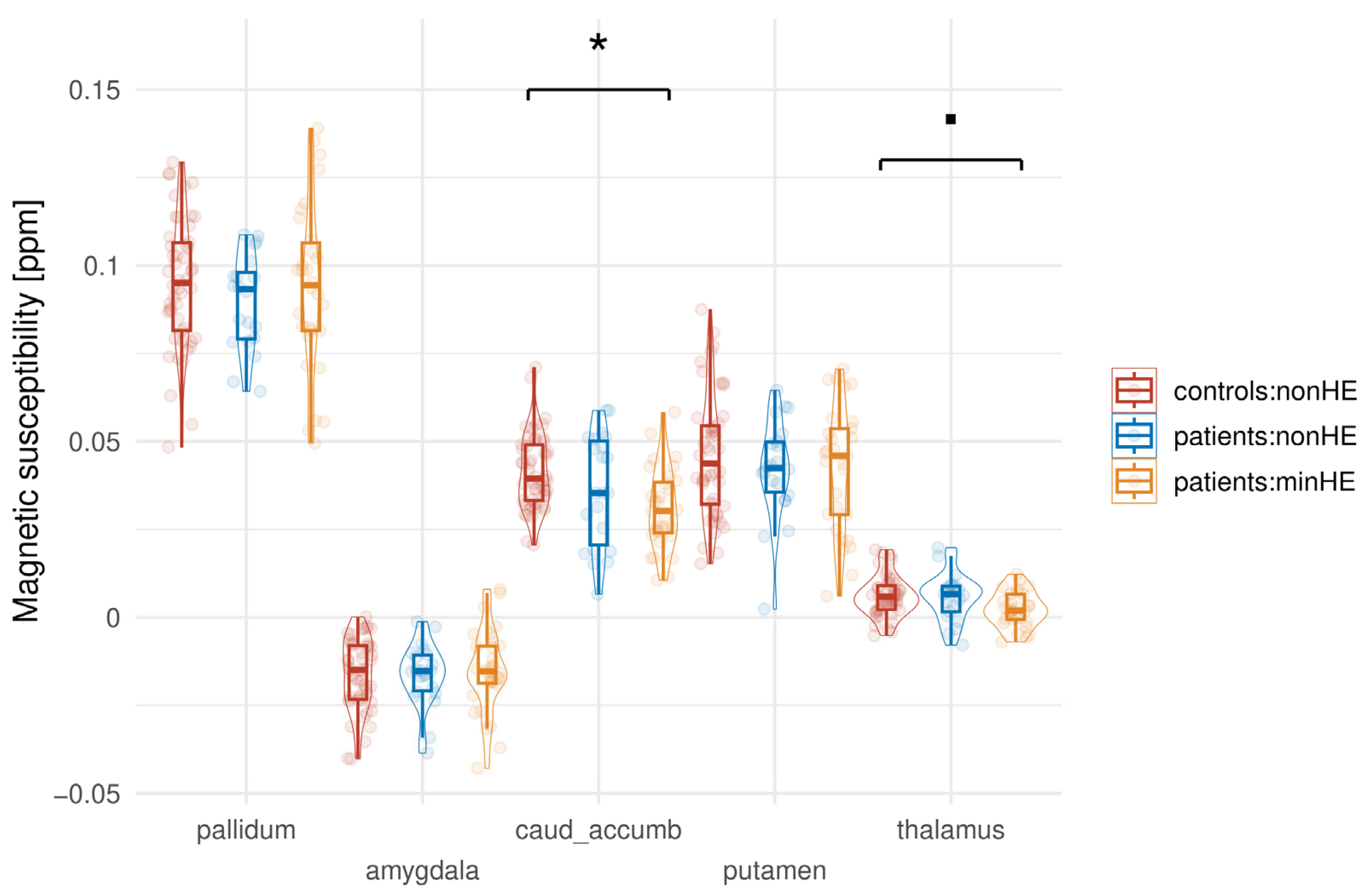 In patients, we found overall lower magnetic susceptibility in the basal ganglia and thalamus compared to HCs. The mixed-effect model indicates that subjects in the patients_minHE group have significantly lower susceptibility values in the CNA compared to the reference Control group (est. = −0.010732, std.err. = 0.003565, df = 52.4,