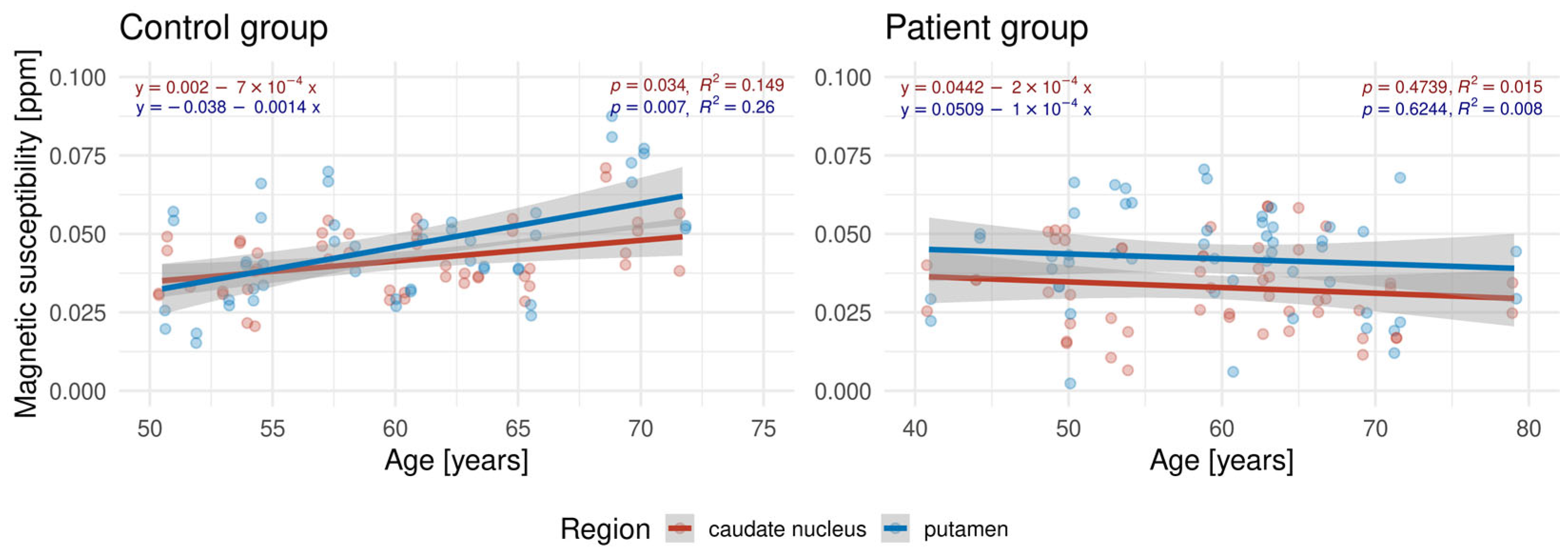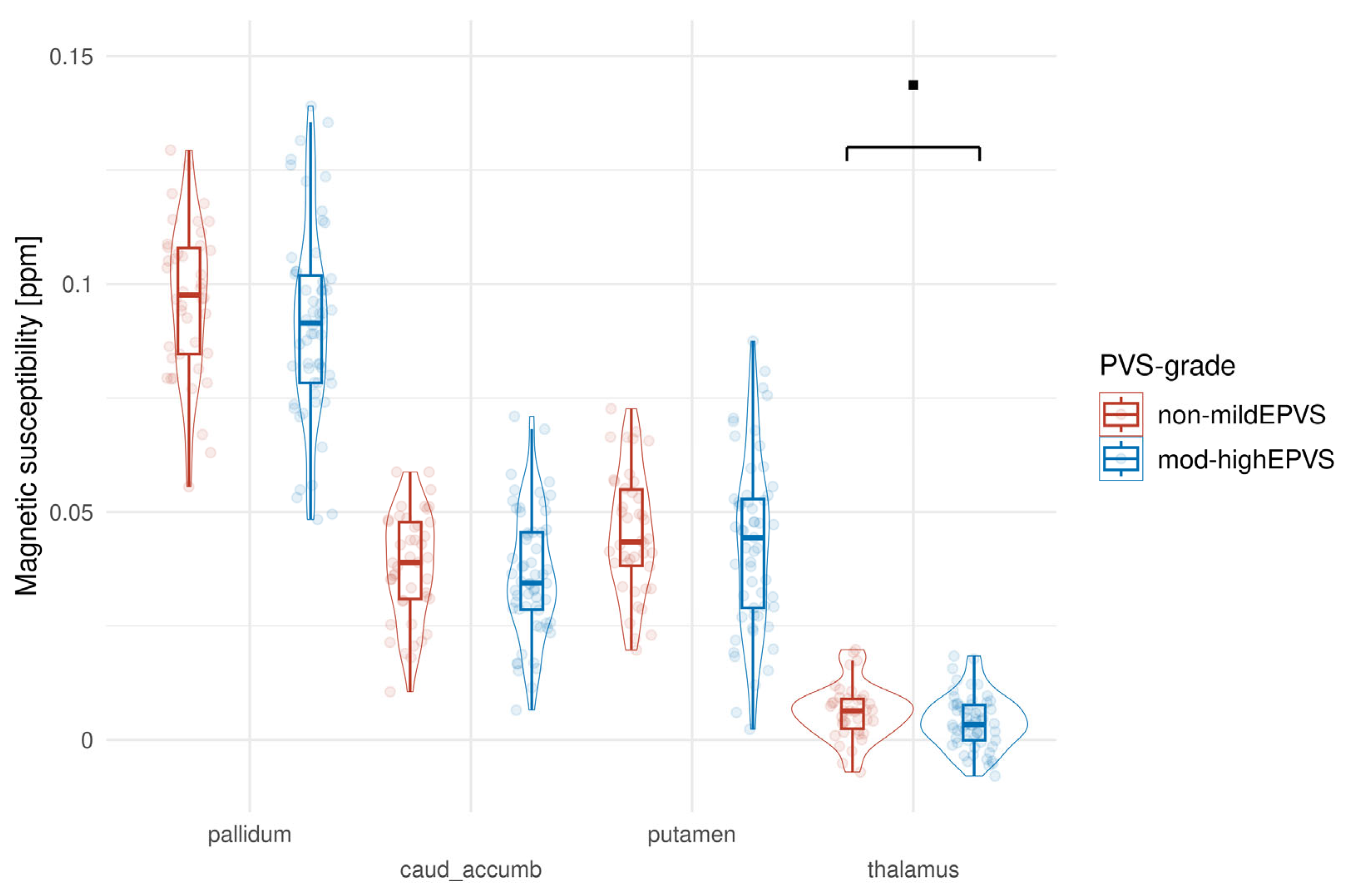 39]. Consequently, in deep gray matter regions with high iron content and therefore higher magnetic susceptibility (χ normally up to +0.18 ppm), EPVS lead to a diamagnetic shift toward lower susceptibility values. Global assessment of these structures might also pick up small enlargements or perivascular spaces of small vessels that cannot be resolved with the limited resolution of conventional MRI. The ceiling of age-related iron accumulation in these structures and disease-induced acceleration usually occurs in the third to fourth decade of life, which could also explain why iron-related susceptibility changes might play only a minor role in our study. This becomes relevant when comparing our results with previous studies in which the included patients were much younger [