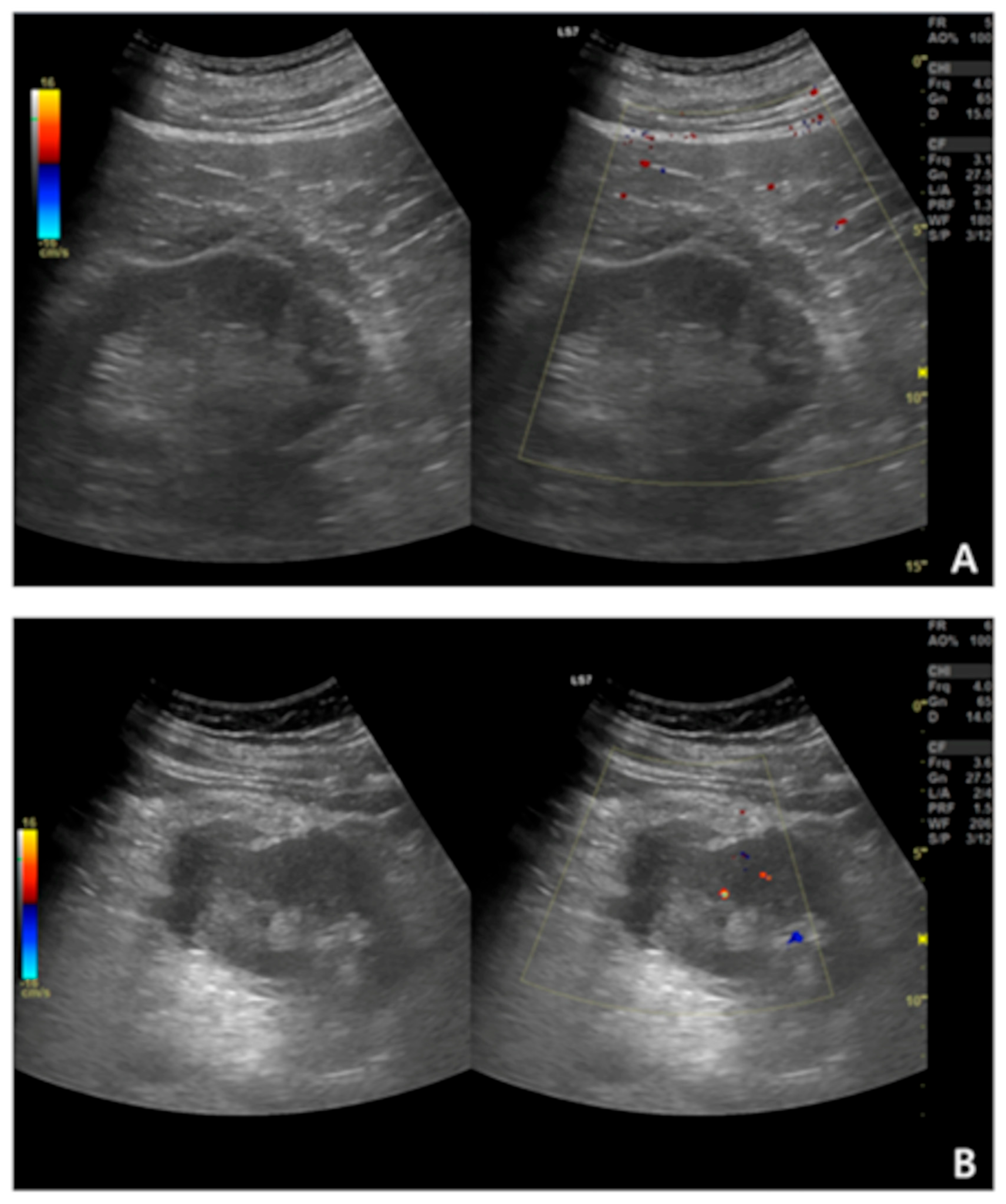- Grzelak, P.; Kurnatowska, I.; Nowicki, M.; Strzelczyk, J.; Durczyński, A.; Podgórski, M.; Stefańczyk, L. The diagnostic value of contrast-enhanced ultrasonography in the assessment of perirenal hematomas in the early post-operative period after kidney transplantation. Clin. Transpl. 2013, 27, E619–E624. [Google Scholar] [CrossRef] [PubMed]