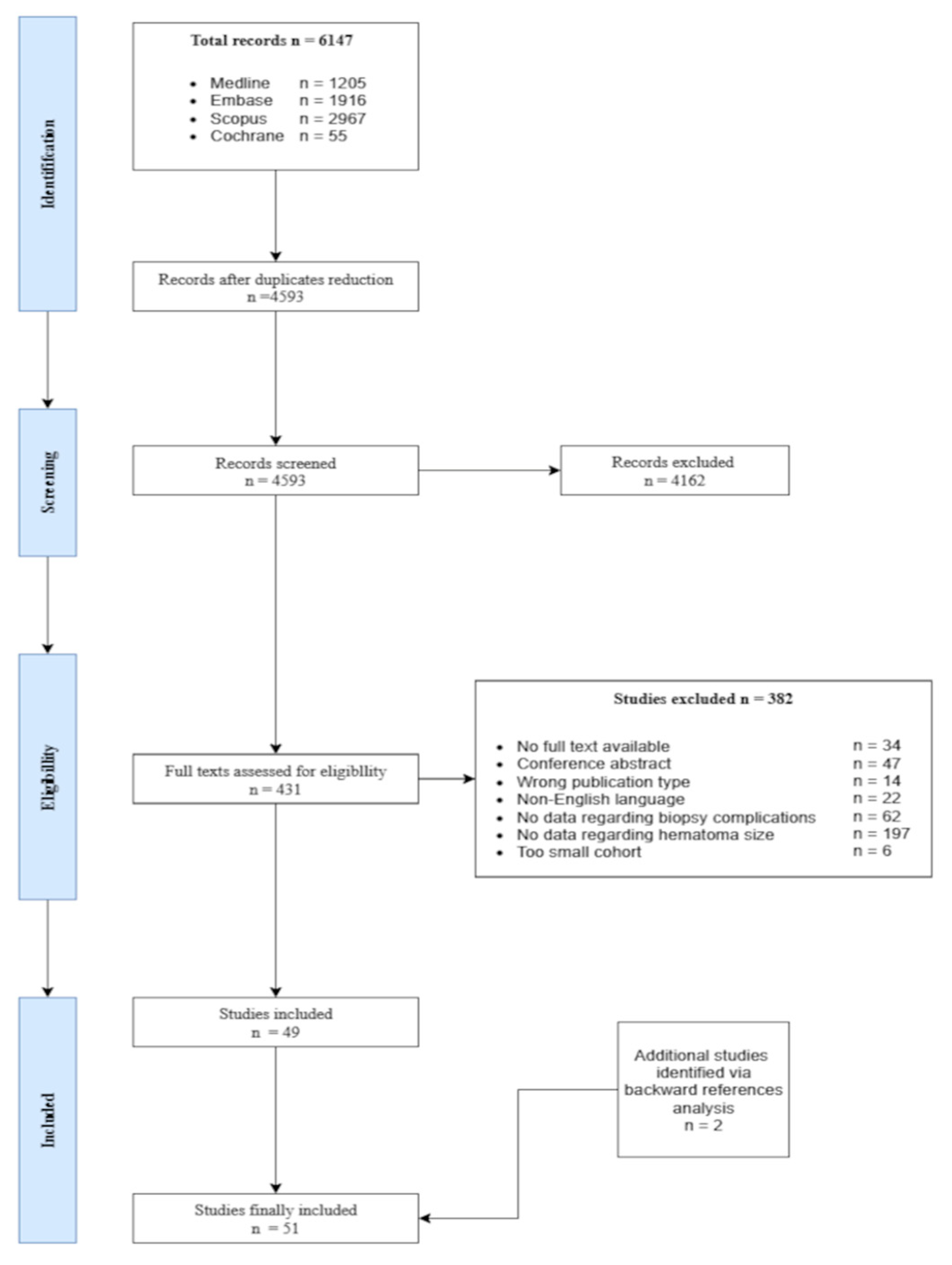 - Studies with mixed populations (e.g., adults and children, or different biopsy types) were included only if relevant data for adult patients undergoing US-guided PRB could be separated; otherwise, such studies were excluded.