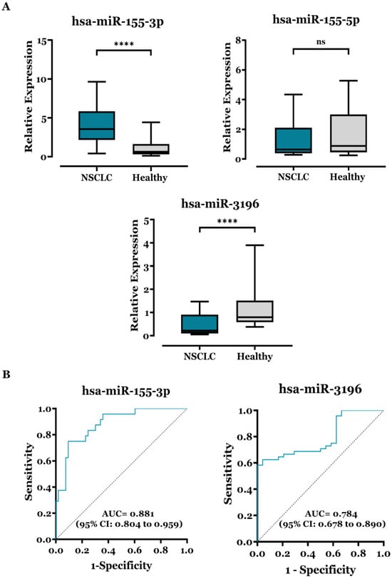 Differential miR expression in PBMCs with ROC curves between NSCLC patients and the healthy donors’ group. (A) RT–qPCR analysis of miR-155-3p, miR-155-5p, and miR-3196 expression levels in NSCLC patients and a healthy donors’ group. The expression levels of the three miRs were normalized relative to the corresponding expression level of U6 snRNA, and relative expression was determined using the 2−ΔΔCt method. The Mann–Whitney test was used to assess group differences, and results are expressed as means ± SEM and displayed as box plots. **** p < 0.0001 and “ns”: non-significant. Data population after outlier exclusion for multiple miRNAs was: miR-155-3p (NSCLC n = 63, controls n = 28), miR-155-5p (NSCLC n = 23, controls n = 12), and miR-3196 (NSCLC n = 55, controls n = 28). (B) The receiver operating characteristic (ROC) curve analysis of PBMC miR-155-3p and miR-3196 for NSCLC detection. AUC (95% CI) are displayed on the curves.