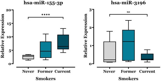 We also investigated the potential association between dysregulated miR expression and the patients’ smoking habits. The study group was categorized into three subgroups: non-smokers (individuals with no history of active smoking), former smokers (individuals who had abstained from smoking for at least the last five years), and current smokers. Results revealed a significant association between miR-155-3p expression levels and smoking history, as shown in Figure 3. Specifically, miR-155-3p expression was significantly higher in current smokers (mean of 7.70 ± 0.73) than non-smokers (mean of 2.58 ± 0.25). This indicates a potential association between active smoking and the upregulation of miR-155-3p in ADC patients. On the contrary, the expression levels of miR-3196 did not show any significant differences across the smoking subgroups, suggesting that miR-3196 expression is independent of smoking history in ADC patients.