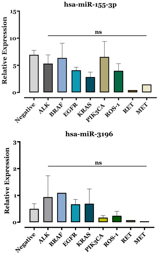 Comparison of miR-155-3p and miR-3196 expression in different gene mutations of ADC patients. RT–qPCR analysis of the differential in miR-155-3p and miR-3196 levels in different gene mutations. The expression levels of miRs were normalized relative to the corresponding expression level of U6 snRNA, and relative expression was determined using the 2−ΔΔCt method. Kruskal–Wallis testing with Dunn’s comparisons was used to assess group differences, and results are expressed as means ± SEM and displayed as bars. No comparison reached statistical significance, and all differences are indicated as non-significant (“ns”).