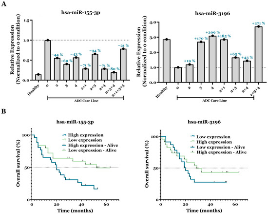Figure 5A illustrates the relative expression levels of miR-155-3p and miR-3196, normalized to untreated patients (baseline or “0 condition”), with percentage changes indicated above each bar. Our findings reveal consistent downregulation of miR-155-3p across all treatment groups relative to the 0 condition, suggesting its suppression in response to therapy and a possible role in regulatory pathways. The most significant decrease (80%) occurred in patients receiving chemotherapy, immunotherapy, and inhibitors (2 + 3 + 4 condition), reducing miR-155-3p expression to levels comparable to those of healthy individuals. Other treatment groups showed moderate downregulation, ranging from 21% to 71%. Conversely, miR-3196 showed a positive regulation across all ADC care line groups. The largest increase (271%) was observed in patients treated with chemotherapy, immunotherapy, and inhibitors (2 + 3 + 4 condition), mirroring the trend observed with miR-155-3p downregulation. This suggests that these treatments strongly induce miR-3196, potentially playing an active role in the biological response to therapy. Other treatment groups also showed substantial increases in miR-3196 expression, ranging from 19% to 209%. These findings highlight miR-3196 as a potential therapeutic biomarker and reinforce the differential regulatory roles of both miRs in ADC treatment response.