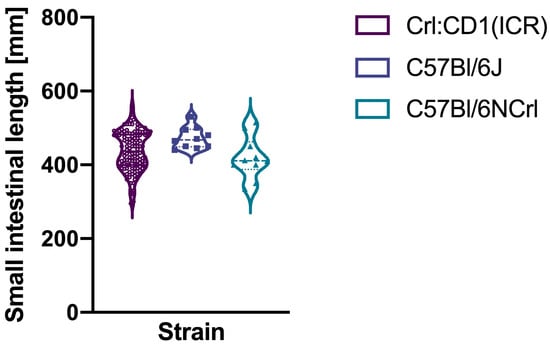 The mean small intestinal length of Crl:CD1(ICR) mice was 437 mm (standard deviation 54), while it was 473 mm (standard deviation 29) in C57Bl/6J mice and 419 mm (standard deviation 57) in C57Bl/6NCrl mice (Figure 3). The respective coefficients of variation were 12.4% (95% confidence interval: 11–14.2%), 6.1% (95% confidence interval: 4.2–11.2%), and 13.6% (95% confidence interval: 9.3–25.2%). They were more likely to be similar between the out- and inbred strains (modified signed likelihood ratio 5.878, p = 0.053).