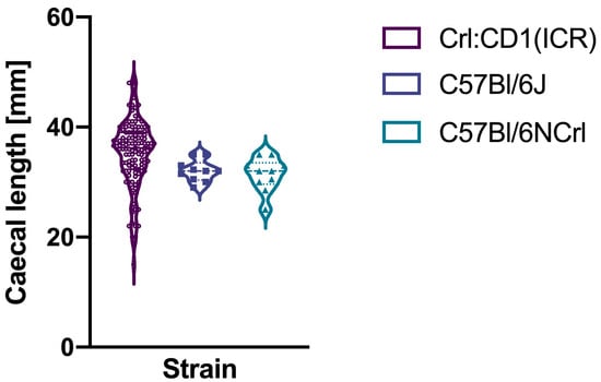 One might argue that we compared inadequately sampled populations from the Crl:CD1(ICR), the C57Bl/6J, and C57Bl/6NCrl mice due to their increased age. Due to our adherence to the 3R-guidelines and the ethical obligations arising from it, we were not free to decide their ages as we had to take them when they were no longer needed for other experiments. Although the ages of the different genetic backgrounds differ, this is unlikely to have a relevant effect for the matter of similar coefficients of variation in small intestinal lengths. The explanation for this is rooted in the growth curve of mice [,,]. While the growth in body weight is linear to age in days in the first days of life [,], it speeds up afterwards to almost exponential growth []. These growth curves were also applicable to the C57Bl/6 background [] and ICR-outbred [] mice. Of note, the variability in body weight of the C57Bl/6 background has been described to be rather small compared to other strains []. So, for example, standardisation by age often includes mice between six to nine weeks [], six to ten weeks [], or eight to twelve weeks [], while they were only scarcely limited to “~6 weeks” []. As these age intervals are still within the parts of the growth curves where substantial weight gain occurs, this standardisation is likely to introduce substantial variation. This is also the case for 20–25 g [,,], even more for 12–16 g [], and also for “approximately 25 g” [] or “~25 g” [] due to the associated positions on the growth curves. This suggests that the variability in mice sampled from these parts of the growth curves is likely to be even higher than in our cohorts, where additional weight gains are much smaller. The analysis of covariance with subsequent post hoc testing included in our study during peer-review did not support an effect of age on intestinal length.