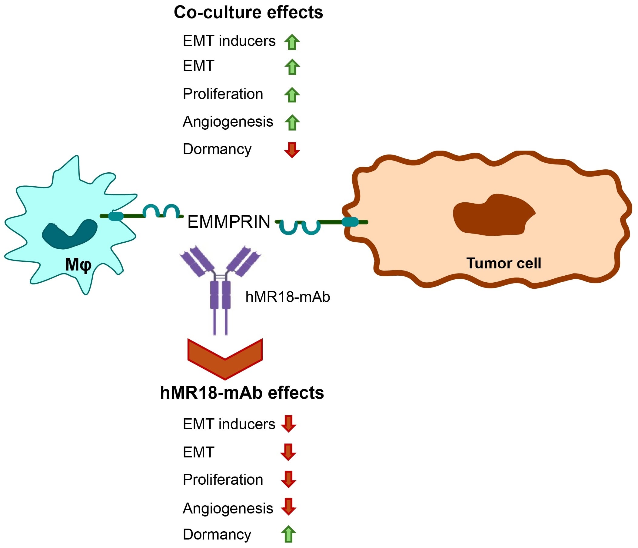 The Anti-EMMPRIN Monoclonal Antibody hMR18-mAb Induces Tumor Dormancy and Inhibits the EMT Process in Human Carcinoma Cell Lines Co-Cultured with Macrophages