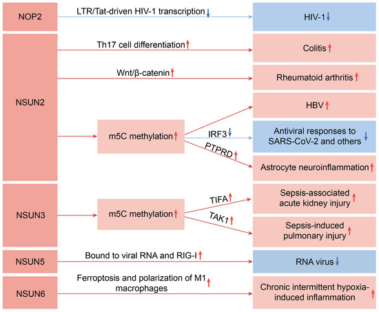 Schematic diagram of the main pathways through which the NSUN family genes influence inflammatory diseases. The red upward arrow represents an increase, and the blue downward arrow represents a decrease.