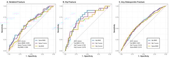 When considering fractures at different sites, discrimination ability was limited (AUCs ranging from 0.560 to 0.621; Table 8). Femoral neck BMD and T-scores showed the highest discriminatory performance, but sensitivity and specificity did not exceed 65% at the optimal cut-offs.