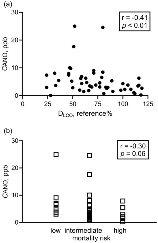 DLCO negatively correlated with CANO in all patients (Figure 3a) and also in patients with group 1 and group 4 PH (p < 0.001, r = −0.52). Of note, there was a trend for association between CANO and mortality risk category at diagnosis in PH groups 1 and 4 (Figure 3b). Other clinical parameters listed in Table 1 and Table 2 did not correlate with CANO (p > 0.05).