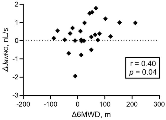 The increase in JawNO showed a positive correlation with the absolute increase in 6MWD (p = 0.04, r = 0.40, Figure 5) in the whole population and also in group 1 PH (p = 0.02, r = 0.59). The multivariate analysis confirmed that the change in JawNO was independently associated with the change in 6MWD, even after adjustment for demographic, lung function, and treatment-related variables (detailed results are shown in Supplementary Table S2). However, no relationship was noted to the change in NT-proBNP concentrations, WHO-FC, or the four-strata risk categories (p > 0.05).