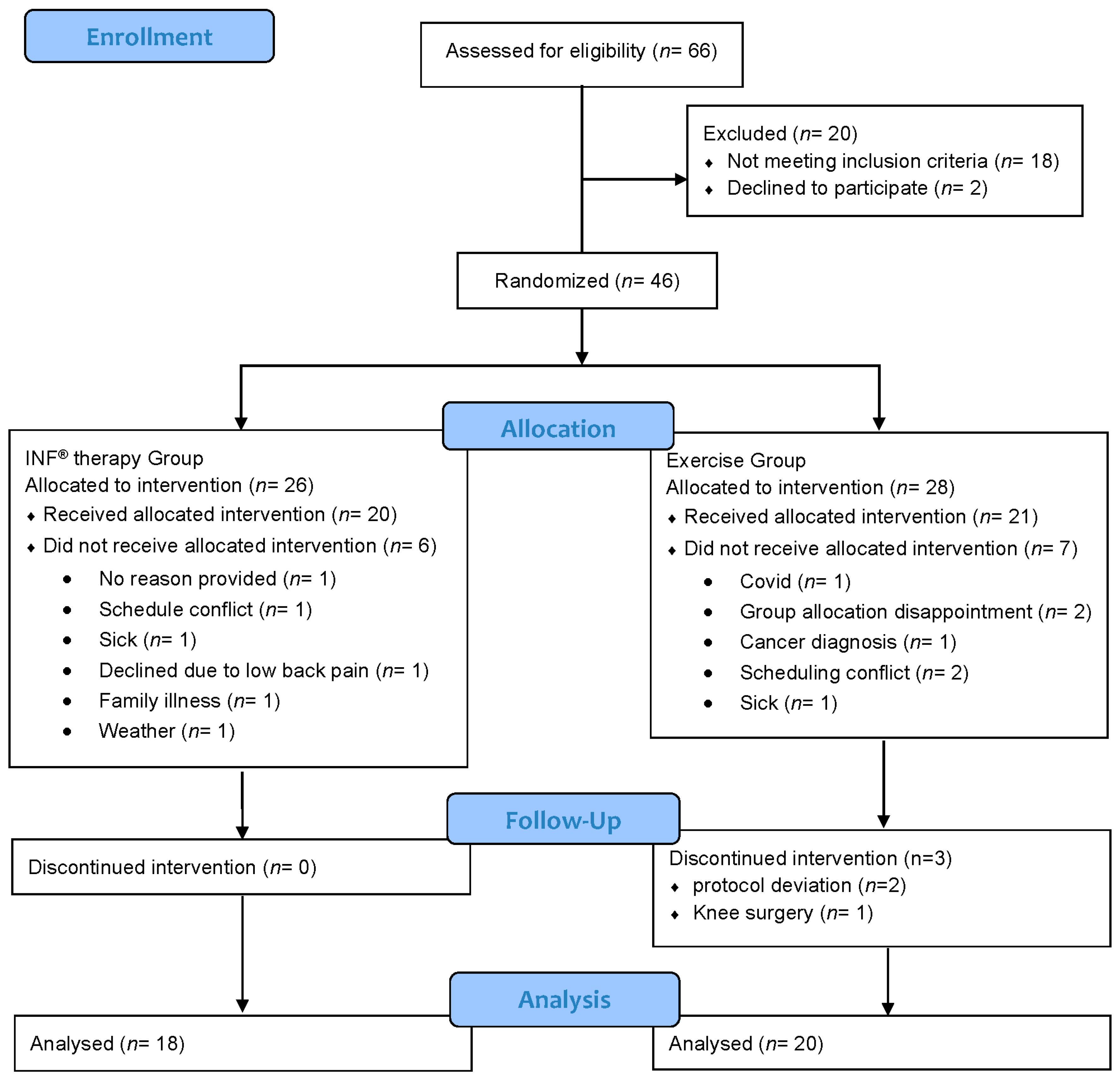 | Questionnaire | INF® Therapy Group n = 20 | Exercise Group n = 18 | |||||||