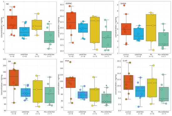 Effects of LK00764 treatment on striatal neurotransmitter and metabolite concentrations in four experimental groups (control, LK00764, PS, PS+LK00764) shown as boxplots. Statistically significant differences between groups are indicated as * = effect compared to control group; * p < 0.05. NE = norepinephrine, DOPAC = 3,4-dihydroxyphenylacetic acid, 5HIAA = 5-hydroxyindoleacetic acid, DA = dopamine, HVA = homovanillic acid, 5-HT = serotonin.