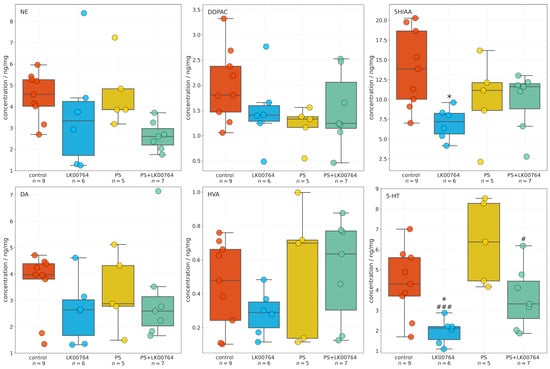 Boxplots showing the effects of LK00764 treatment on hippocampal neurotransmitter and metabolite concentrations across four experimental groups (control, LK00764, PS, and PS+LK00764). Statistically significant differences between groups are indicated as * = effect compared to control group; # = effect compared to PS group; * p < 0.05, # p < 0.05, ### p < 0.001. NE = norepinephrine, DOPAC = 3,4-dihydroxyphenylacetic acid, 5HIAA = 5-hydroxyindoleacetic acid, DA = dopamine, HVA = homovanillic acid, 5-HT = serotonin.