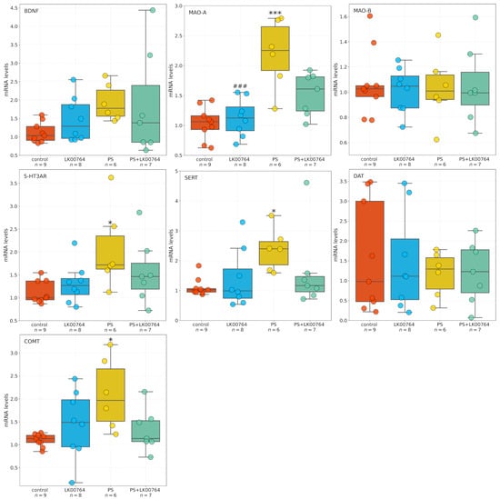 Effects of LK00764 treatment on striatal gene expression in a rat model of CPTSD. Boxplots illustrate the distribution of mRNA expression levels for SERT, 5-HT3A, MAO-A, MAO-B, COMT, and BDNF across experimental groups. * = effect compared to control group; # = effect compared to PS group; * p < 0.05; ** p < 0.01; *** p < 0.001; # p < 0.05; ## p < 0.01.