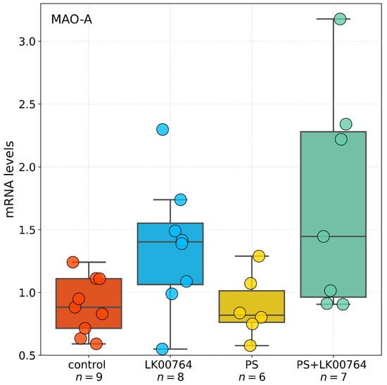 For MAO-A, strong and consistent effects were found across multiple pairwise comparisons. The drug-only group differed significantly from both PS () and PS+LK00764 () groups, while both PS () and PS+LK00764 () differed from controls. These findings indicate pronounced stress-related upregulation of monoamine oxidase A, which is further modulated by drug administration. The combined pattern suggests that stress exposure drives substantial enzymatic changes in monoaminergic metabolism, with LK00764 exerting an additional, potentially bidirectional regulatory influence.