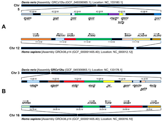 Next, we compared the assemblies of the genes of the zebrafish locus atxn2l on chromosome 3 (Danio rerio: assembly GRCz12tu (GCF_049306965.1); position: NC_133178.1) with those of the ATXN2L locus on chromosome 16 (Homo sapiens: assembly GRCh38.p14 (GCF_000001405.40); position: NC_000016.10). Only one locus, the sh2b1 gene in zebrafish, is identified as the SH2B1 gene in the arrangement of the human ATXN2L locus (Figure 2B). The synteny of the sh2b1 and atxn2l loci indicates an evolutionary relationship between the two gene arrangements in humans and zebrafish, in contrast to the atxn2 gene in zebrafish, for which no syntenic regions were found in the chromosomal region of human ATXN2.