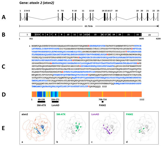 Atxn2 gene and protein in zebrafish. (A) Schematic presentation of the structure of the atxn2 gene on the inverted strand of chromosome 5. The gene covers a genomic region of 63.76 kb and contains 23 coding exons. (B) The derived mRNA (Ensembl: transcript ID ENSDART00000083656.5 atxn2-201) has 4204 nucleotides with an open reading frame (black box) between the nucleotide 352 in exon 1 and the nucleotide 3690 in exon 23. (C) The translated Atxn2 protein contains 1112 amino acids (translation ID: ENSDARP00000078091.4). The amino acids from each exon are identified by different colors (black: an exon; blue: another exon; red: another exon residue overlaps the splice site). (D) The Ensembl atxn2 transcript matches the UniProt identifier A2CF3, which indicates the AlphaFold confidence for identified domains in zebrafish Atxn2. Alphafold generates a Pro-Residue Confidence Score (PLDDT) between 0 and 100: dark blue: very high (pLDDT > 90); light blue: confident (90 > pLDDT > 70; yellow: low (70 > pLDDT > 50); orange: very low (pLDDT < 50). Some regions with low pLDDT may be unstructured in isolation. The highest values were identified in the N-terminal region of the zebrafish Atxn2. (E) (a)The AlphaFold predicted model of the Atxn2 protein of the Ensembl zebrafish ENSDARP00000078091 indicates (b) an SM-ATX domain, (c) an LsmAD domain, and (d) a PAM2 motif. The protein domains are highlighted and marked by arrows.