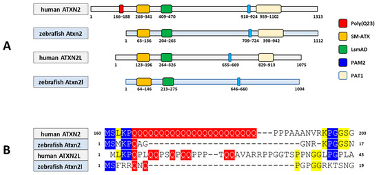 Next, we focused on potential functional domains in the Atxn2 and Atxn2l proteins of zebrafish. The Ensembl database analysis showed two domains at the N-terminal end (SM-ATX, LsmAD) and a third PAM2 motif that are consistent with the known representative domains for ATXN2 and ATXNL in humans and other species [69,70,71,72,73,74]. The two known SM-ATX and LmsAD domains [75] interact with the DEAD-box helicase 6 (DDX6). The PABP-interacting motif PAM2 has been identified as an important binding site (pfam00658) in various eukaryotic proteins and found in a variety of eukaryotic proteins [56,71,76,77]. This motif interacts with PABP’s C-terminal MLLE domain. PABP is an RBP with function for polyA tailing, translation, mRNA decay and miRNA silencing [2,71,78].