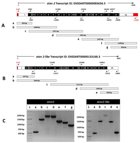 We used a similar approach for atxn2l. According to the ZFIN database, the Ensembl transcript ID ENSDART00000133168.3 (atxn2l-201) has a length of 3681 nucleotides. A BLAST search in NCBI in the refseq_rna database for Danio rerio (taxid: 7955) yielded an annotated atxn2l mRNA transcript (NM_212684.3) with a length of 3607 nucleotides, which overlaps with four predicted Danio rerio atxn2l transcript variants (X1–X4). We used the sequence data from genomic DNA (BX784026.17) to extend the 5′ end of the Ensembl transcript ID ENSDART00000133168.3 (atxn2l-201) for primer selection for RT-PCR (red box in Figure 6B).