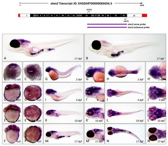 Atxn2 expression patterns in zebrafish embryos and larvae. In situ hybridization was performed on embryos and larvae of the brass line (1-cell—10 dpf) and the casper line (17 dpf). (A) Expression domains of atxn2 in the whole larva (17 dpf) detected by antisense probes in the coding region of the transcript, denoted by the left arrow below the schematized transcript (upper image). (B) Sense probes (indicated by right arrow, upper image) show a weak background coloration throughout the larva (17 dpf). The images (C–F) show side views and (C′–F′) show views from the animal pole of atxn2 expression from the zygote to the embryos in the 16-cell stage. The images (G,I,K,M) show side views and (H,J,L,N) dorsal views of whole embryos (2 dpf, 4 dpf) and larvae (10 dpf and 17 dpf). Enlarged head sections of lateral pictures are shown in (G′,I′,K′,M′) and of dorsal pictures in (H′,J′,L′,N′). Abbreviations: bl (blastomere), ca (cerebellar anlage), cb (cerebellum), ey (eye), fb (forebrain), hb (hindbrain), mo (medulla oblongata), ob (olfactory bulb), ot (optic tectum), re (retina), rh (rhombencephalon), te (telencephalon), th (thalamus).