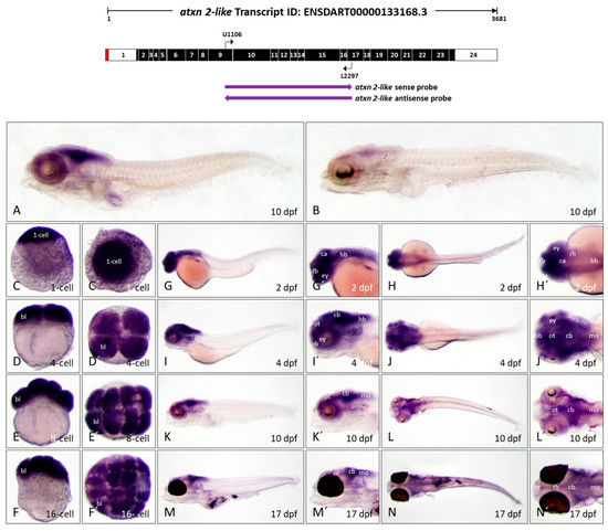 To detect atxn2l expression during zebrafish development, a segment of transcript ENSDART00000133168.3 was chosen to create antisense and sense probes for WISH, as illustrated in Figure 8 (top). The probe region (1192 nucleotides) detects transcripts between exon 9 and exon 17 (schematically shown in Figure 8, upper image). An antisense probe comprising 1192 nucleotides, specific to atxn2l, was utilized on whole-mount larvae at 10 days post-fertilization, as depicted in Figure 8A. The same transcript region for the sense probe (control) showed only minimal background staining (Figure 8B). The WISH results showed that atxn2l transcripts are also detected in early embryonic developmental stages. The zygote (1-cell) and all embryonic cells after the first cell divisions have high atxn2l transcript levels, as evidenced by strong staining of blastomeres at the 2-cell, 4-cell, and 16-cell stages (Figure 8, sagittal views C–F, views from the animal pole C’–F’). In the 2-day-old zebrafish embryo, a high expression of atxn2l can be observed in the brain and in the medulla oblongata. Low expression of atxn2l is visible in the spinal cord, while almost no expression is detectable in the remaining trunk and tail tissues (Figure 8G,G’,H,H’). In 4-dpf zebrafish embryos, atxn2l is primarily expressed in the telencephalon, optic tectum, rhombencephalon, cerebellum, and medulla oblongata. In addition, high concentrations of atxn2l transcripts are also found in the retina of the eyes (Figure 8I,I’,J,J’). In the 10-day-old zebrafish embryo, the expression pattern is even more pronounced. The expression domain within the telencephalon is diminished. High expression is confined to the regions of the optic tectum, the cerebellum, the medulla oblongata, and the eyes (Figure 8K,K’,L,L’). The same expression domains of atxn2l exist in the 17-day-old zebrafish larva. However, atxn2l is predominantly expressed in the posterior regions of the brain, with significantly high expression levels in the optic tectum, cerebellum, and medulla oblongata. The spinal cord in the posterior part of the body also weakly expresses atxn2l, which is more visible in the dorsal view (Figure 8M,M’,N,N’). Since the eyes of the 17 dpf old zebrafish embryos of the casper line are highly pigmented, no conclusions could be drawn about the expression of atxn2l in the retina of the eyes at this stage of development.