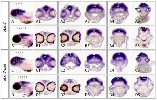 In situ hybridization of a whole embryo can also lead to overstaining of highly expressed tissue. To visualize the expression domains of the atxn2 and atxn2l genes more precisely, cryosections of the head region of already stained embryos (4 dpf) and larvae (17 dpf) were prepared (Figure 9). The position of the cryosections (10 μm) is indicated for each embryo (2 dpf and 4 dpf) and larva (10 dpf and 17 dpf) by numbers (1–5) in an anterior to posterior order (Figure 9A–D). The expression domains of atxn2 are clearly visible in different regions of the brain of the 4 dpf old embryo of the brass line. Atxn2 is expressed in the retina, thalamus, hypothalamus, optic tectum, and cerebellum. The level of expression in the hypothalamus is lower than in the thalamus, optic tectum, and cerebellum (Figure 9(A1–A5)). The tissue sections of a 17 dpf old zebrafish embryo of the casper line show that atxn2 is expressed in the same brain regions as in a 4 dpf old embryo. However, the expression strength of atxn2 is reduced and only more pronounced in the thalamus and optic tectum (Figure 9(B1,B2)) but is still high in the cerebellum and medulla oblongata (Figure 9(B3–B5)). In 4dpf embryo tissue sections, atxn2l and atxn2 are both expressed in the same brain regions. Atxn2l is expressed particularly in the thalamus, hypothalamus, optic tectum and cerebellum of a 4-day-old zebrafish embryo (Figure 9(C1–C5)). In a 17-day-old zebrafish, the atxn2l expression domains are similar to those of a 4 dpf old embryo. However, more restricted domains are found in the thalamus and the optic tectum (Figure 9(D1–D2)), compared to the cerebellum and the medulla oblongata, which still have high levels of expression (Figure 9(D3–D5)). Due to the natural eye pigmentation of the casper line, the retina cannot be determined with certainty as a possible expression site of atxn2 and atxn2l at this stage of development of 17 dpf old larvae.