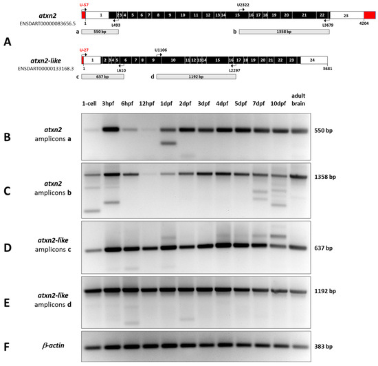 The results of atxn2l expression in zebrafish development are illustrated by two amplified PCR products of the 5′-end (637 bp) and a middle region of the coding sequence (1192 bp) of the transcript (Figure 10D,E). The atxn2l amplicon c band (637 bp) (Figure 10D) shows atxn2l transcripts as early as the 1-cell stage and almost constant expression levels in all other developmental stages and in the brain of the adult zebrafish. Weak and shorter transcript variants are detected in the blastula (3 hpf) and gastrula (6 hpf) as well as in the pharyngula period (1 dpf). Weak longer splice variants are present at 1 dpf, 4 dpf, 5 dpf, 7 dpf, and 10 dpf. In the brains of adult zebrafish, no splicing event for the 5′-end of atxn2l was detected. The amplicons d, which indicate the PCR products of the atxn2l central region of the coding transcript, show a constant level of expression from the 1-cell stage through all developmental stages up to 10 dpf and in the adult brain (Figure 10E). Only weak and shorter splice variants are present in the 1-cell stage, gastrula (6 hpf) and pharyngula (2dpf) periods, and probably in the developmental stage of 5 dpf and 7 dpf. No splicing of the atxn2l amplicon d transcript was found in adult zebrafish brains. The amplicons of b-actin (383 bp) (Figure 10F) show constant amounts of cDNA from all tissues used for PCR as controls.