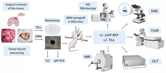 Experimental workflow: a stepwise assessment algorithm. TILs—tumor-infiltrating lymphocytes; GBM—glioblastoma multiforme; ICC—immunocytochemistry; IHC—immunohistochemistry; qRT-PCR—quantitative reverse transcription polymerase chain reaction; LIVP-RFP—vaccinia virus Lister strain from the Moscow Institute of Virus Preparation encoding the red fluorescent protein; IVM—in vivo microscopy; MRI—magnetic resonance imaging; OCT—optical coherence tomography; FLIM—fluorescence lifetime imaging microscopy.