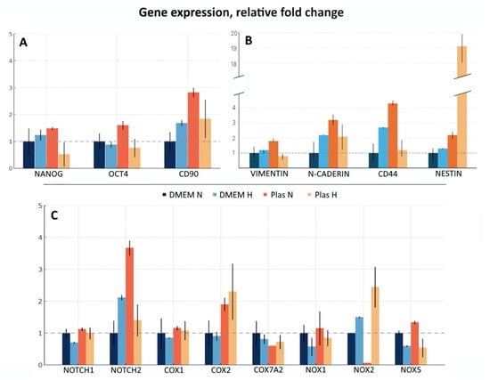 The composition of the culture medium as well as the oxygenation conditions influence cell phenotype and fate. In this study, we tested four culture conditions: in DMEM-F12 under “normoxia”, ~18.6% O2 (hereafter referred to as DMEM N); in DMEM-F12 under “hypoxia”, 5% O2 (hereafter referred to as DMEM H); in Plasmax under “normoxia” (hereafter referred to as Plas N); and in Plasmax under “hypoxia” (hereafter referred to as Plas H). The qRT-PCR was performed, assessing the expression of a broad panel of markers, namely genes encoding well-known markers of stem-like cells (Nanog, Oct4, CD90); proteins involved in cancer cell migration, invasion, and interaction with extracellular matrix (Vimentin, N-cadherin, CD44, Nestin; although Nestin is also a marker of stem-like cells); and proteins involved in cancer cell signaling and metabolism (Notch1, Notch2, Cox1, Cox2, Cox7A2, Nox1, Nox2, Nox5) (Figure 2).