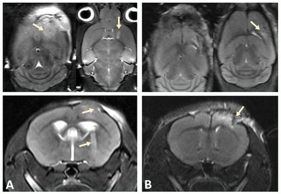 Tumor progression monitored by MRI. (A) On day 10, pronounced cortical growth of glioblastoma and a focus in the subcortical ganglia (indicated by arrows) were observed. (B) Implantation of GBM cells into the cortex of the hemispheres of NSG immunodeficient mice at the same time point was characterized by smaller tumor size.
