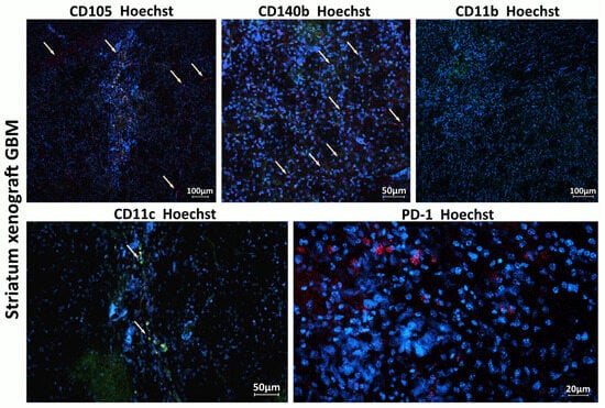 Host immune cells and cells involved in tumor angiogenesis in the TME of xenograft GBM. Staining for CD105+ (red), CD140b+ (red), CD11c (green), CD11b (green), and PD1 (red). Hoechst (blue) was used to stain nuclei. CD105 (endoglin) is a marker typically expressed by endothelial cells involved in tumor angiogenesis; CD140b (PDGFR-β) is a marker of pericytes and stromal cells supporting tumor vasculature; CD11c is a marker of dendritic cells involved in initiating immune response within the tumor; and CD11b is a marker of monocytes, macrophages, and microglia.