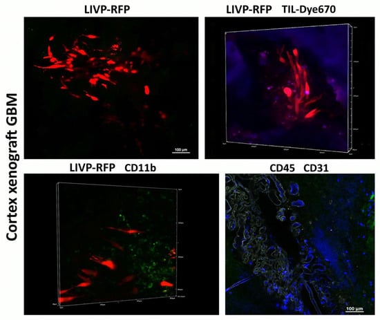 Immunophenotype of cortex xenograft GBM. Delivery of LIVP-RFP (red) and TILs (purple) to human xenograft GBM cells engrafted in mouse brain, as well as recruitment of CD45+ (blue), including CD11b+ (green) mouse cells across BBB CD31(grey) to the tumor. Representative images.