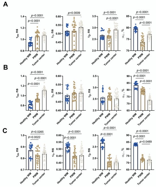In the present study, FLIM was performed on the brain tissue in the xenograft GBM NSG mouse model. All values of fluorescence decay parameters in the NAD(P)H channel are presented in Table 3.