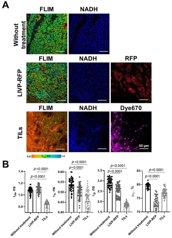 Fluorescence of red fluorescent protein RFP from LIVP-RFP was obtained for brain samples with GBM to identify the tumor zone on FLIM images. The RFP signal was excited by a picosecond diode laser (BDS-594-SM, Becker & Hickl GmbH, Berlin, Germany) at a wavelength of 594 nm with power incident on the sample of 5 µW, and detected at a wavelength of 610 nm, determined by a long-pass filter (610 LP, Chroma, Vermont, BF, USA). Fluorescent images of the far-red fluorescent protein Dye670 from labeled TILs were obtained for brain samples with GBM to identify the tumor zone on FLIM images. The Dye670 signal was excited at a wavelength of 633 nm by a picosecond diode laser, and detected at a wavelength of 670 nm.