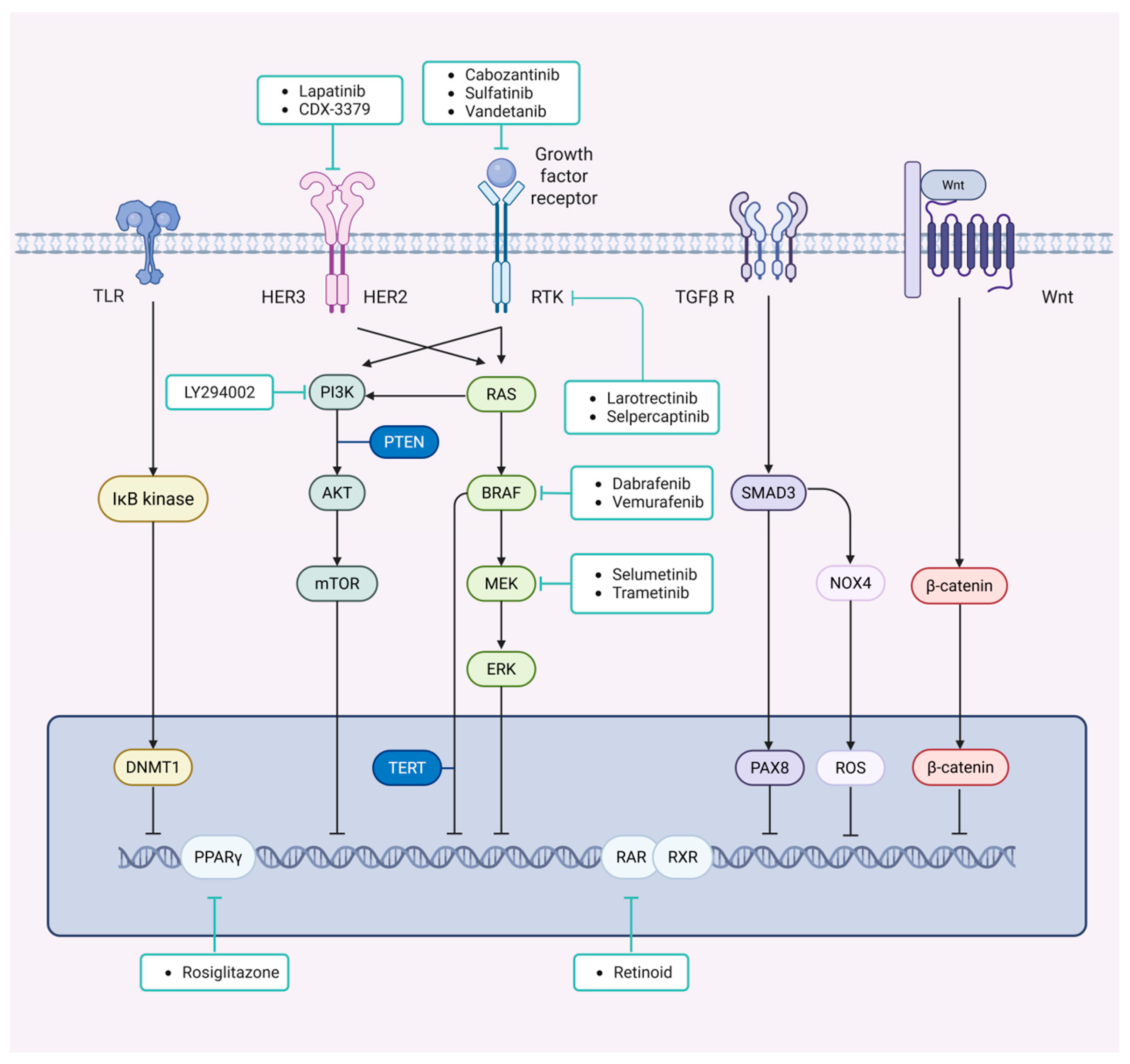 - Zhang, Y.; Xing, Z.; Liu, T.; Tang, M.; Mi, L.; Zhu, J.; Wu, W.; Wei, T. Targeted therapy and drug resistance in thyroid cancer. Eur. J. Med. Chem. 2022, 238, 114500. [Google Scholar] [CrossRef]