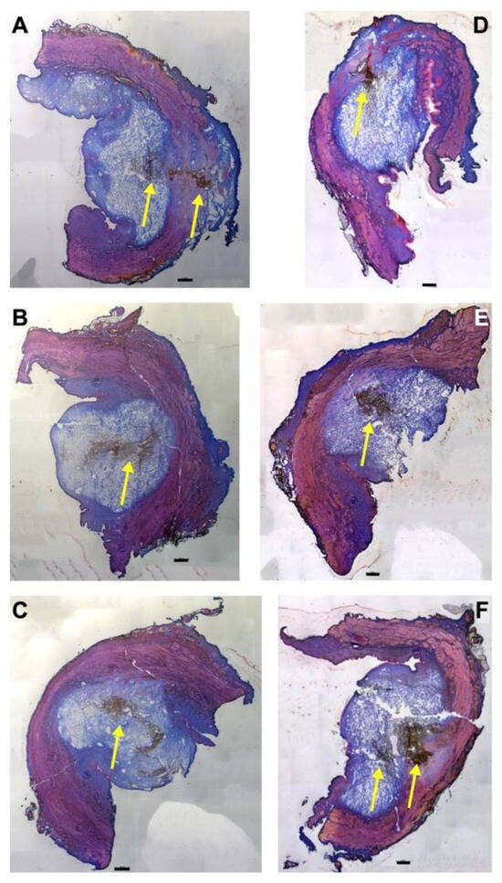 Injection of microparticles in the urethral tissue by a pressure setting of E80. The fMPs were injected into the tissue samples with the elevated pressure profile E80 5 cm below the bladder neck (H5; (A–C)) and 10 cm below the bladder neck (H10, (D–F)), and cryosections were generated and stained by AZAN. The injections distended the connective and muscular tissues. The injected fNPs are recorded as clusters of dark spots (yellow arrows). The black cluster marked in F by a white arrow is considered an artefact as in the surrounding tissue no signs of tissue stretching or liquid injections are observed. The figure displays representative examples of cryosections of the injection sites of the urethrae of six pigs in total. Size bars indicate 1000 μm.