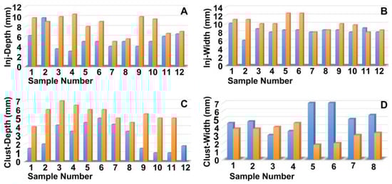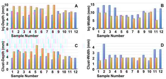 Measuring the positions of the nanoparticles in the tissue targeted. The fNPs were injected by E60 pressure settings at positions H5 (blue bars) and H10 (orange bars), and the injection depth was determined as the distance of the fNPs from the urethral lumen (A), the injection width in the tissue (B), the depths of the fNP clusters in the tissue in the direction of injection (C), as well as the cluster widths in the tissue (D) were determined by bright field microscopy of cryosections and measured by the proprietary software of the microscope. The x-axis presents the tissue samples, and the y-axis the dimensions in mm as indicated.