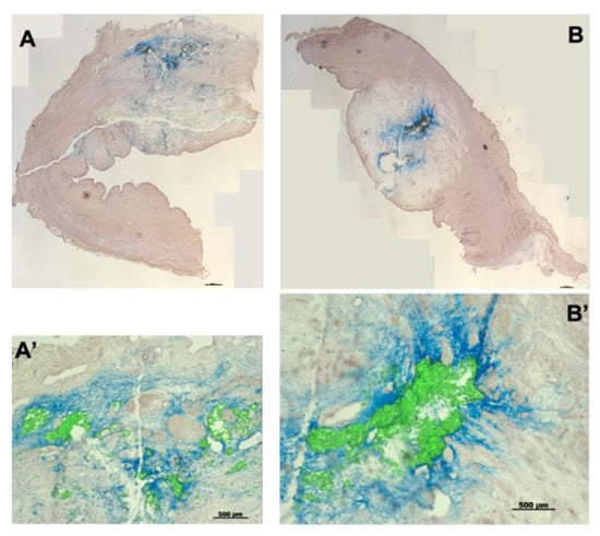 Injection of microparticles and isotonic ink in porcine urethral tissue samples. Fluorescent microparticles and tissue ink were mixed 1:1 and injected at positions H5 (A) and H10 (B) in the urethral tissue samples using E60 pressure settings. Cryosections were generated and stained with HE. The ink penetrated somewhat deeper in the tissue compared to fMPs. (A’,B’) present enlarged image sections. The size bars in (A,B) represent 1000 μm, in (A’,B’) 500 μm, respectively.