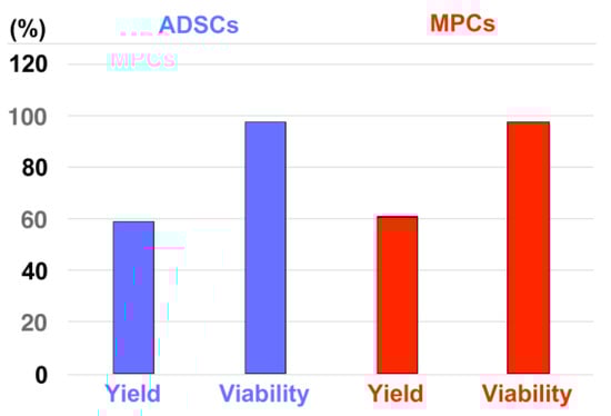 Adipose tissue-derived mesenchymal stromal cells (ADSCs) and myogenic progenitor cells (MPCs) were isolated from pig cadaveric subcutaneous fat tissue or M. extensor carpi radialis, respectively, expanded, and characterised as described [47,48,49]. Upon reaching a confluence of approximately 70%, cells were harvested as described above, and their viability was enumerated. Based on our preparatory study (Figure A2), the ADSCs were diluted to 5 × 106/mL and the MPCs were diluted to 2.5 × 106/mL in their corresponding expansion media and injected by waterjet in 100 μL aliquots in 5 mL cell culture medium using the E10–E60 pressure settings. The injected cells were sedimented by centrifugation (7 min, 300× g, 20 °C), the supernatant was aspirated, the cells were resuspended in 1 mL PBS, and the yield and viability were counted as described above.