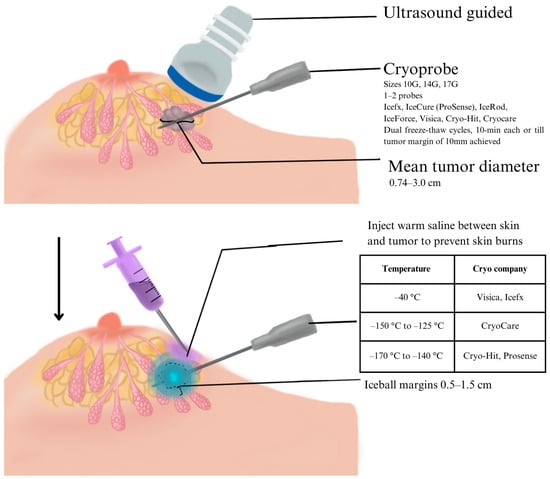 Schematic illustration of ultrasound-guided percutaneous breast cryoablation. The procedure involves real-time ultrasound guidance for accurate cryoprobe placement (10 G–17 G, typically one to two probes), targeting small, unifocal breast tumors (mean diameter 0.74–3.0 cm). Dual freeze–thaw cycles (approximately 10 min each) are applied until a 10 mm tumor margin is achieved. Warm saline is injected between the skin and the tumor to prevent thermal injury. The “iceball” margin typically extends 0.5–1.5 cm beyond the tumor boundary. Common cryotherapy systems include Visica, Icefx, IceCure (ProSense), IceRod, CryoCare, and Cryo-Hit, with operating temperatures ranging from −40 °C to −170 °C, depending on the device.