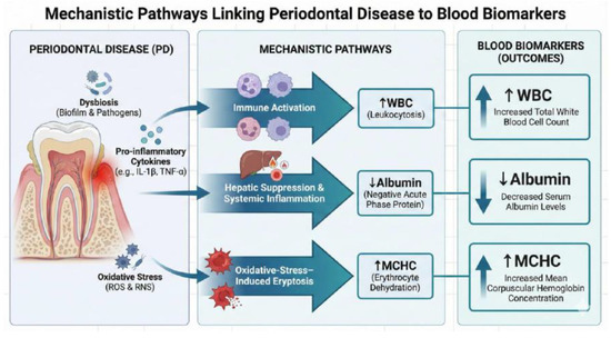 Proposed mechanistic pathways linking periodontitis to systemic hematologic and biochemical alterations. Note: The causal relationship cannot be inferred from this cross-sectional figure.