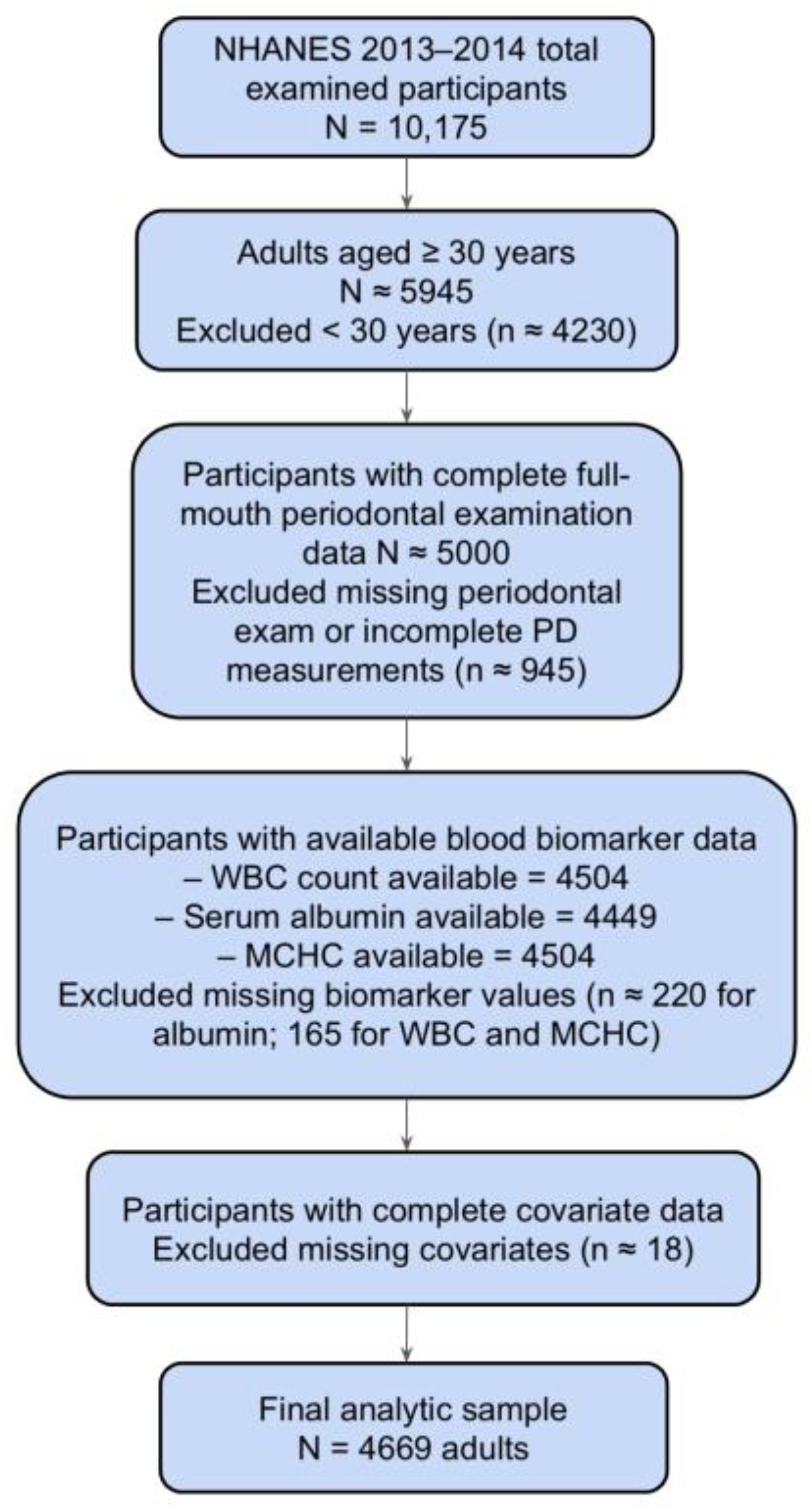 Alshammari, D.; Alharbi, Y.; Alshuaib, A.; Haidar, Z.; AlAli, F.; Alenezi, Y.; Alqaderi, H.; Hamoud, B. Association Between Periodontal Disease and Blood Biomarkers in U.S. Adults: A Cross-Sectional Study. Biomedicines 2025, 13, 2991. https://doi.org/10.3390/biomedicines13122991